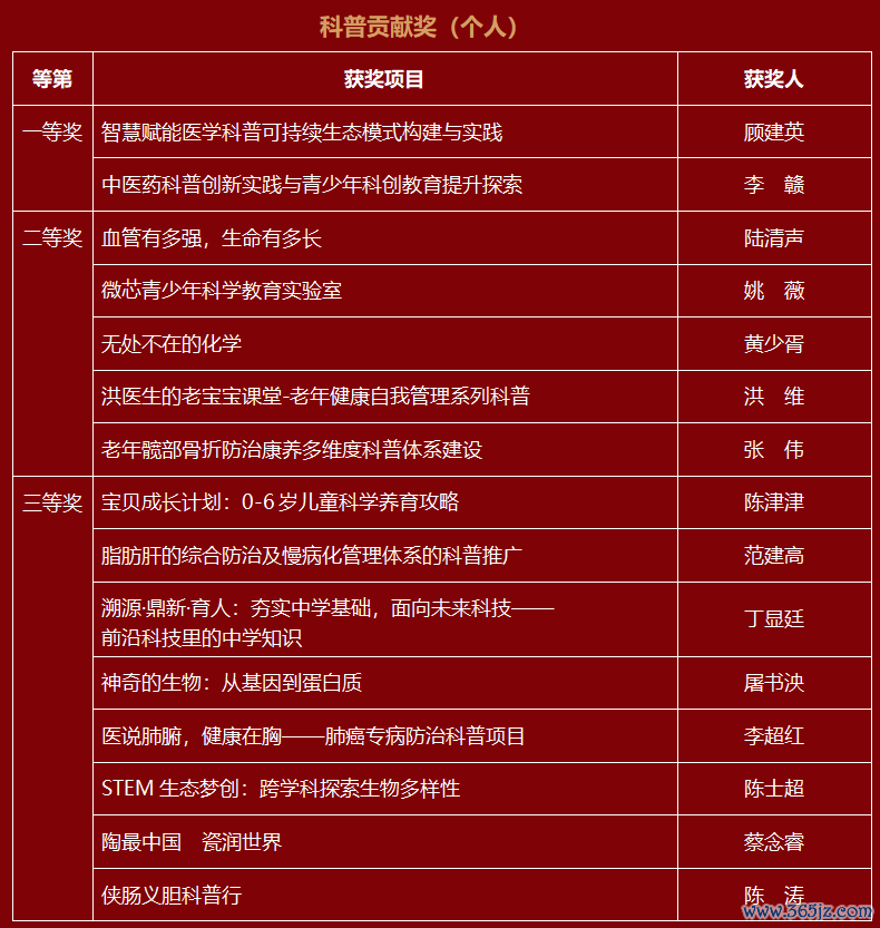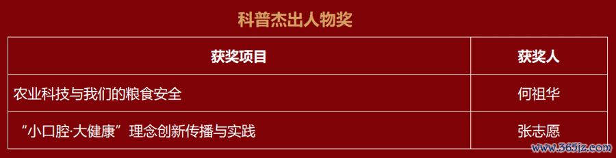 中国科学院院士、中国科学院分子植物科学特等改进中心连络员何祖华,中国工程院院士、国度口腔医学中心名誉主任张志愿栽植,因其在农业科技、口腔健康科普方面的特等孝敬,获评“科普了得东谈主物奖”。
